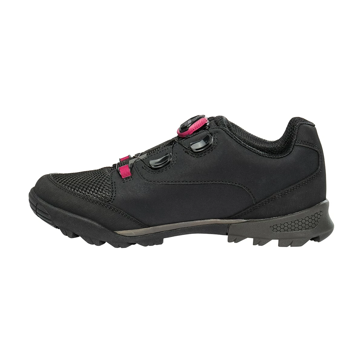 The dynamic tread pattern provides a larger contact area and good abrasion resistance. The bolt-on cover of the cleat system allows you to either ride with or without cleats. A nylon reinforcement ensures best power transfer to the pedal. The sole is convex for easy walking. Besides, it offers high shock absorption on midfoot and instep.